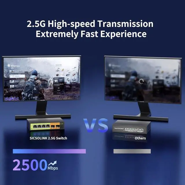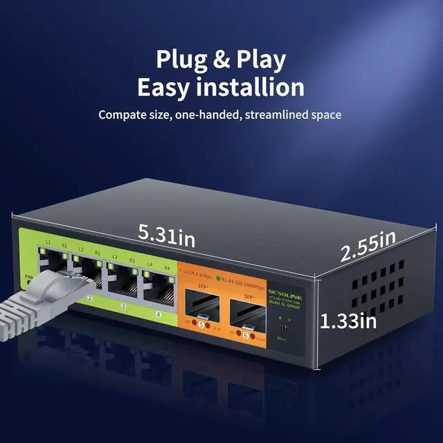 2.5G Ethernet SwitchSICSOLINK 2.5G switch equipped with 4 x 2.5G RJ45 ports and 2 x 10G SFP. It provides 60Gbps full duplex backplane capacity. All ports support wire-speed forwarding for your devices and allowing you to easily upgrade your network.