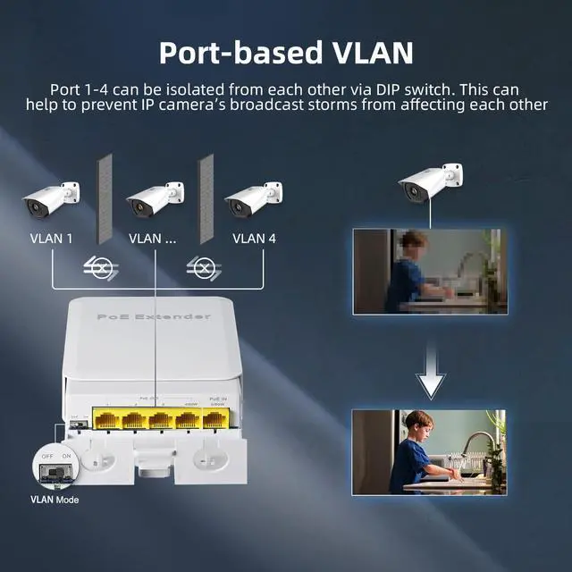 Plug & Play Support power detection automatically detect devices, just plug in the ethernet cable, connect directly to the device, led display the port status, without configuration. *Please note not support 24V passive PoE*. Support VLAN mode, controlled by dipswitch