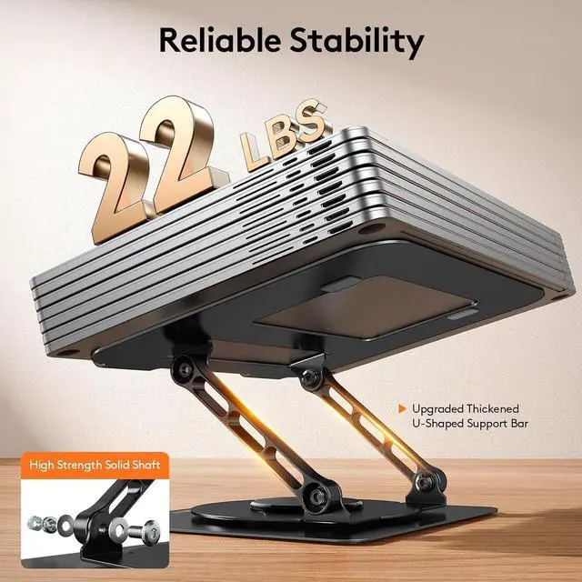 22-POUND STABLE WEIGHT CAPACITY: This adjustable laptop stand is crafted from durable, thick, reinforced aluminum, combining lightweight portability with industrial-grade strength, supporting up to 22 pounds. The non-slip silicone pads protect your laptop from scratches. This laptop stand is corrosion-resistant, scratch-resistant, and heat-resistant, ensuring long-term reliability even with intense daily use.