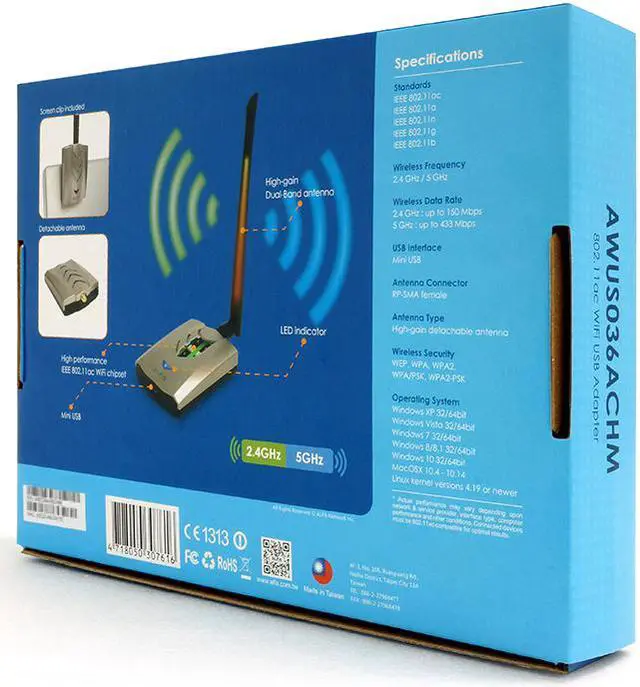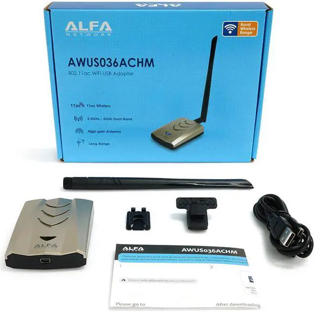 The high receive sensitivity coupled with the internal power amplifier also allow it to pick up Wi-Fi signals from up to 3 times the distance of newer internal 802.11 ac Wi-Fi cards shipping inside today's laptops. This is brand new in retail box and includes the adapter, a 5 dBi dual-band detachable antenna, and a clip you can use to attach it to a laptop LCD bezel. We buy direct from ALFA and are an authorized retailer of ALFA products. Check directly with ALFA to verify you are getting a 100% genuine ALFA adapter.