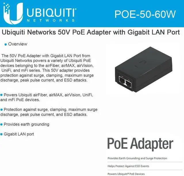 The 50V PoE Adapter with Gigabit LAN Port from Ubiquiti Networks powers a variety of Ubiquiti PoE devices belonging to the airFiber, airMAX, airVision, UniFi, and mFi series. This 50V adapter provides protection against surge, clamping, maximum surge discharge, peak pulse current, and ESD attacks.