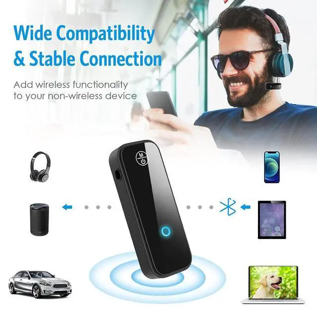 Enjoy Wireless Music - Transmitter and ReceiverThis Bluetooth aux adapter can connect to car audio systems, home stereos, speakers, and wired headphones. Using the aux Bluetooth adapter in receive mode, wired devices can play the music from your phone. In transmitter mode, Bluetooth devices can receive sound from wired devices. Experience freedom from tangled audio cables and enjoy music wherever you go.