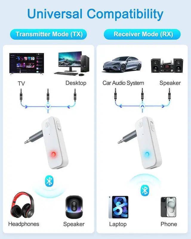 Transmitter and Receiver: This Bluetooth car adapter is designed with a mode switch; you can switch between Transmitter and Receiver modes with one key, and it will automatically enter pairing mode after turning on the switch, which is very convenient to use.