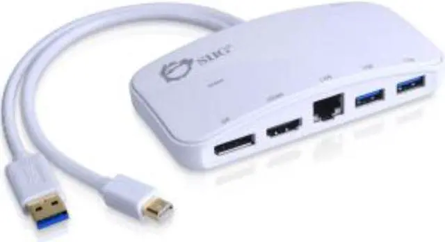 SIIG's Mini-DP Video Dock with USB 3.0 LAN Hub - White allows you to convert your Mini DisplayPort video source to either HDMI or DisplayPort output. It ensures your Mini DisplayPort-equipped computer such as MacBook or Surface Pro series computers to be compatible with HDMI or DisplayPort display. Two USB 3.0 ports with SuperSpeed data transfer rate of up to 5Gbps are provided to support smooth and efficient connections. One Gigabit Ethernet port is also available to enable fast and reliable wired network connection. Compact and lightweight design with no external power adapter required makes it super portable to carry.