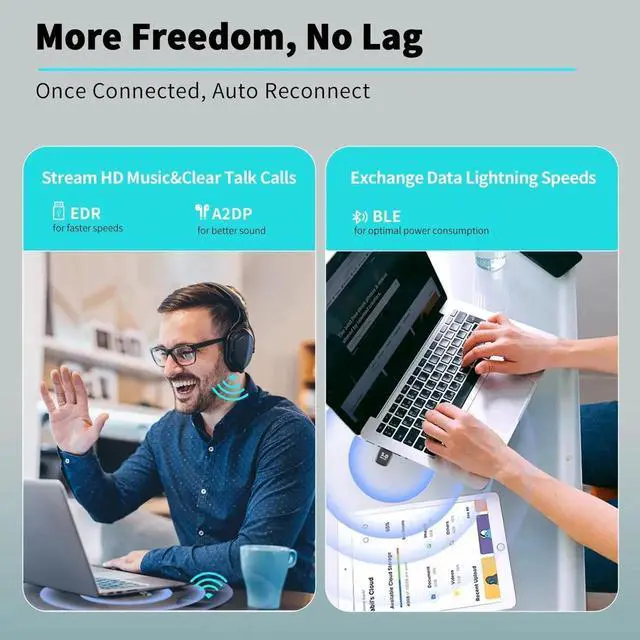 Bluetooth 5.4 dongle for PC Laptop supports up to 5 devices to be connected and can work together at the same time without interfering with each other, Which means that you can listen to high-quality music while using the keyboard or other devices.