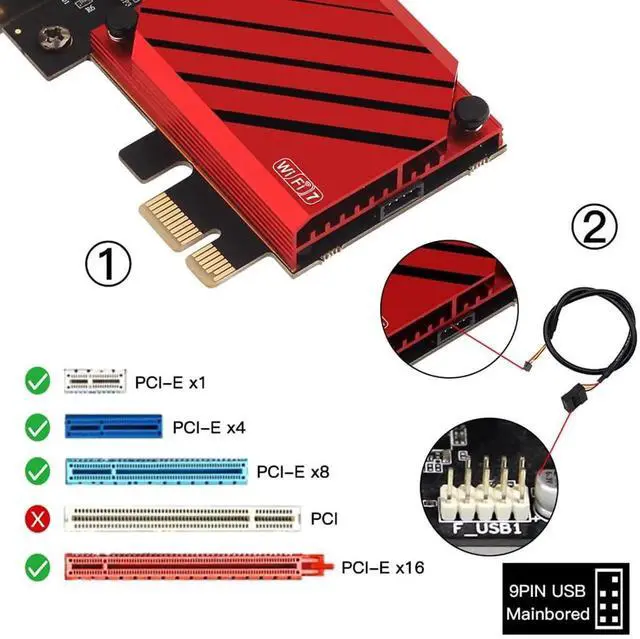 WiFi 7 pcie wifi card support Tri-band( 2.4GH z, 5GHz, 6GHz) Transmission, 6GHz maximum data rate of almost 5.8 Gbps, which is 2.4X faster than the 2.4 Gbps possible with Wi-Fi 6/6E and could easily enable high quality 8K video streaming, 5GHz data rates up to 2400Mbps, 2.4GH z date rates up to 574Mbps.