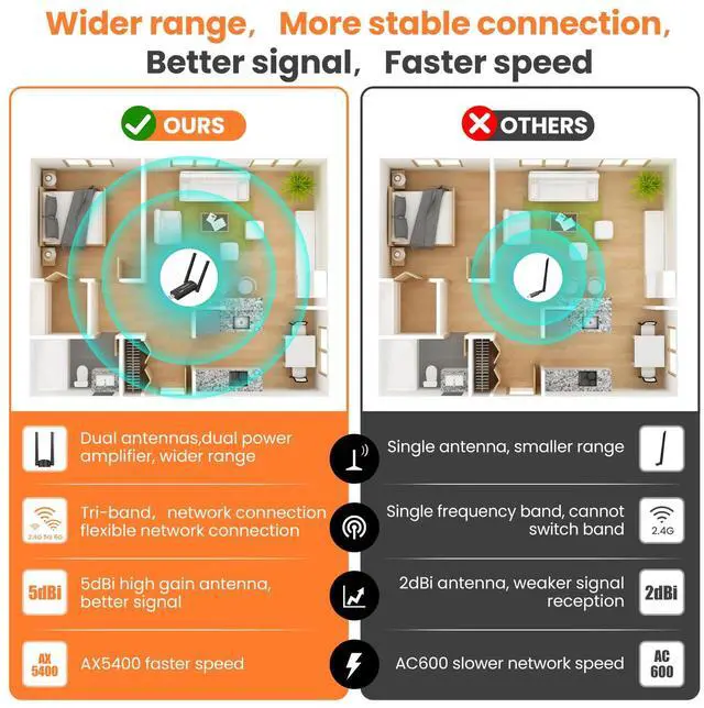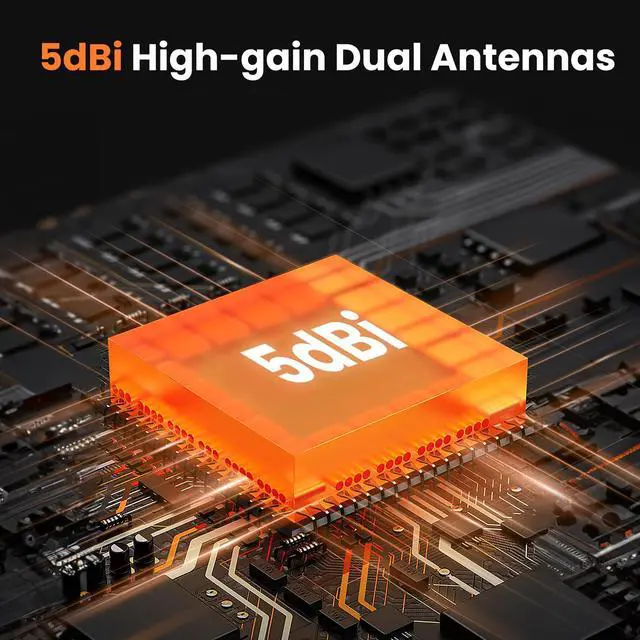 - Equipped with dual 5dBi rotating antennas, this WiFi adapter provides powerful signal coverage, greatly enhancing the range and stability of your wireless connection. This means you can enjoy a more reliable and seamless online experience without worrying about signal dropouts.
