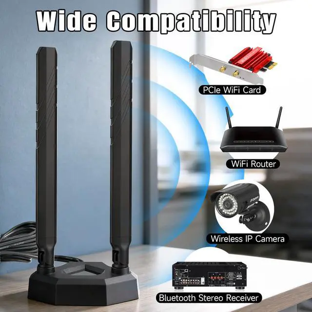 Wide Compatibility: Ideal external antenna upgrade for WiFi routers, modems, PCIe WiFi/Bluetooth cards, desktop PCs, gaming motherboards, wireless access points, range extenders, security IP cameras, etc
