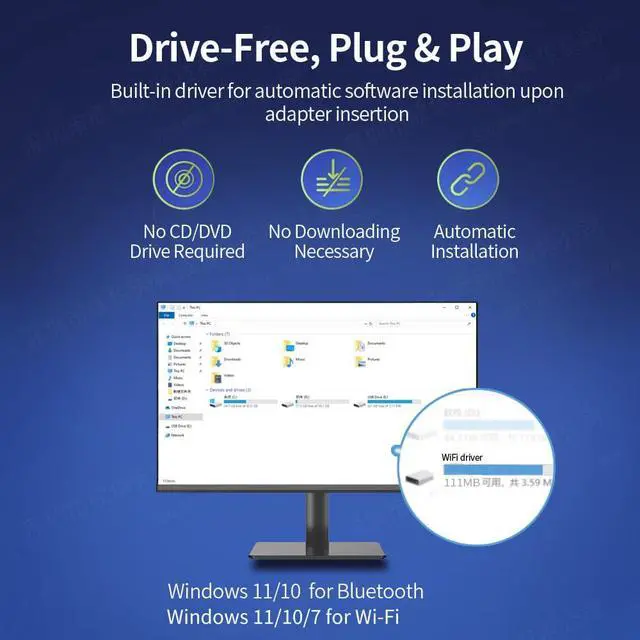 The WiFi Bluetooth adapter comes with a pre-loaded driver—no CD or downloads required.