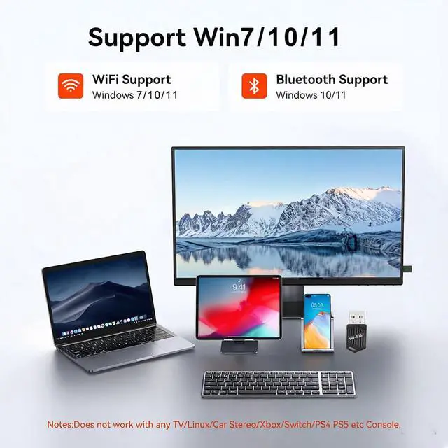The wifi bluetooth adapter works with Windows 11/10. Note: Mac and Linux are NOT supported. Connect to a WiFi 6 router for optimal performance.