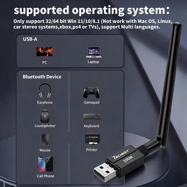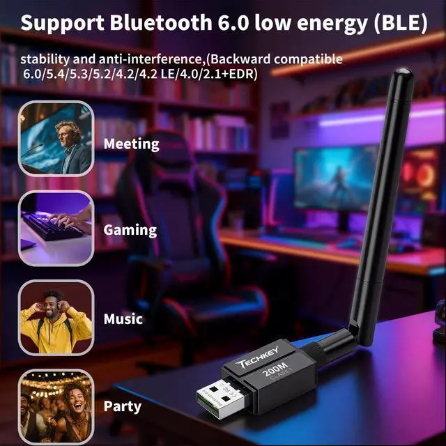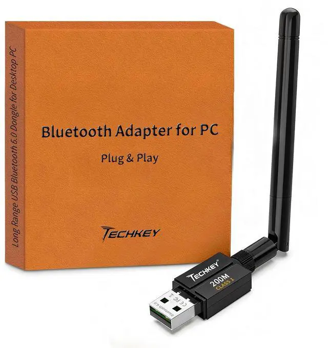 Long Range Bluetooth Adapter: Techkey USB Bluetooth 6.0 dongle utilizes Class 1 radio technology and features an extended antenna, providing a transmission range of up to 600ft/200m in open areas, ensuring that Bluetooth connections are no longer limited by distance. (Please note that physical obstructions and wireless interference may affect the actual transmission range.)