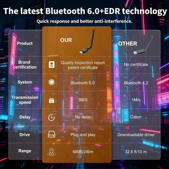 Fast Transmission Rate: With EDR technology and Bluetooth Low Energy (BLE) configuration, this upgraded Bluetooth 6.0 adapter achieves speeds of up to 3Mbps, greatly improving transmission rates and reducing efficiency loss due to interference in the 2.4GHz band. This allows for fast, seamless wireless data connections between your computer and Bluetooth devices.
