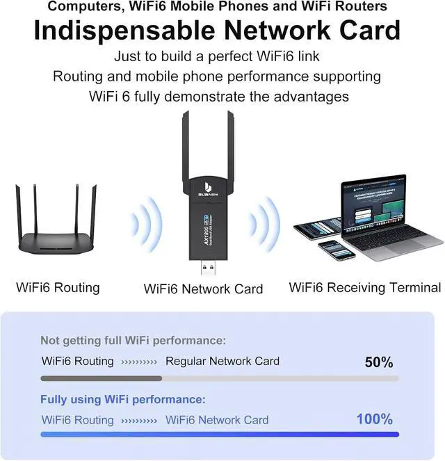 USB 3.0 WiFi Adapter with 10X Speed Boost Full-speed USB 3.0 port provides 1.2Gbps throughput (vs. USB 2.0's 480Mbps). Backward compatible with older USB ports ideal for upgrading desktop PC or laptops without built-in WiFi6