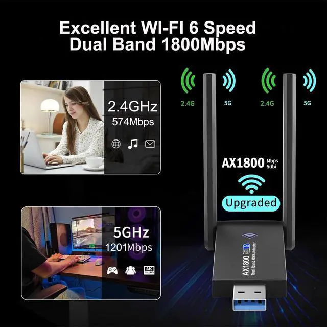 This powerful wifi adapter delivers high performing Wi-Fi 6 network to your device through a simple USB port. With speed up to 1201 Mbps on 5GHz and 574 Mbps on 2.4GHz, web surfing, gaming, and 4k streaming online is much more enjoyable without buffering or interruptions.