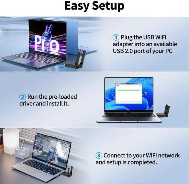 Our wireless adapter has a compact design and is easy to carry. Most Win10/11 computers can automatically detect and install the driver, plug and play.