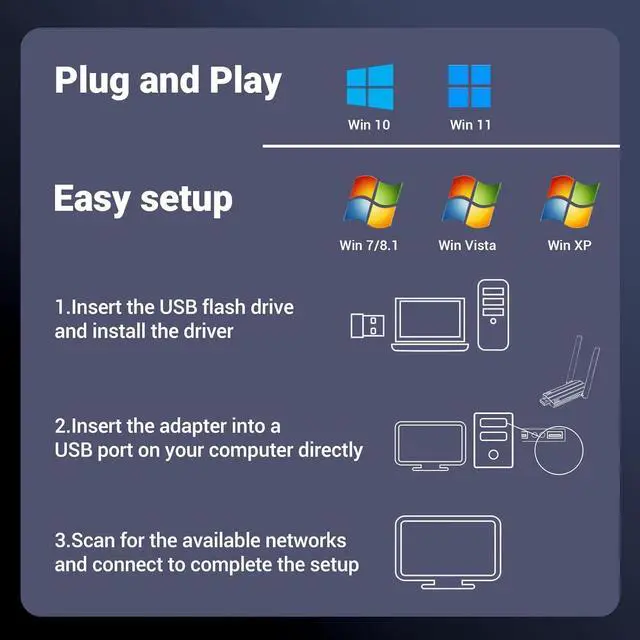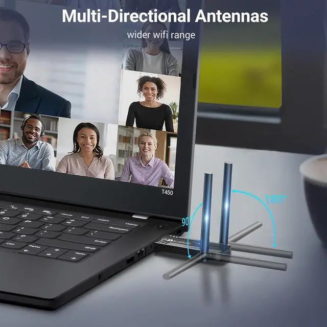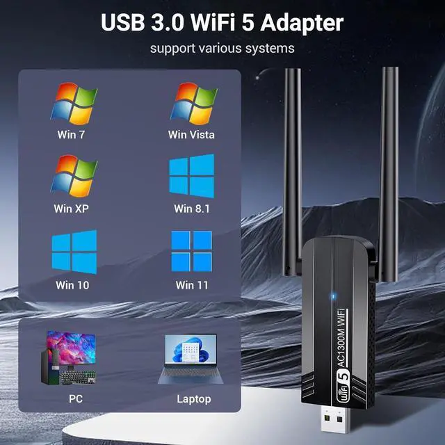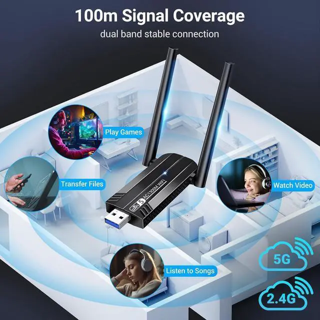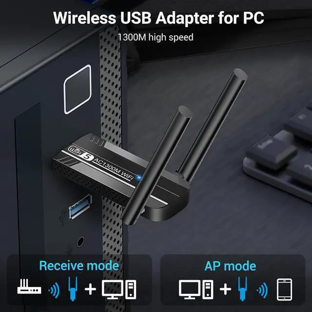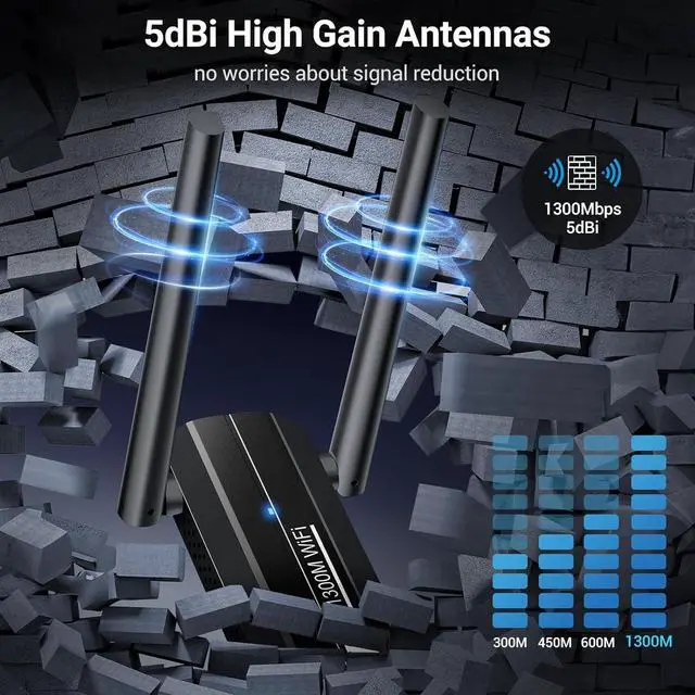 Our WiFi USB stick 1300Mbps supports dual-band network connectivity, including 5.8 GHz and 2.4 GHz, which is suitable for a wide range of applications and can significantly improve the quality of your network connection