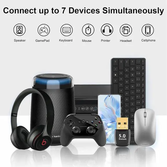 7 Devices Connecting Simultaneously: Our PC Bluetooth dongle supports pairing with 7 different types of Bluetooth devices at the same time without interfering with each other and save USB port. ( Bluetooth speaker, Mouse, Keyboard, GamePad, headphones, printer, cellphone)