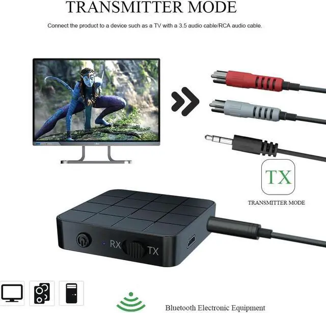 4.Switch between transmitter and receiver modes with the simple flick of a switch. Effortlessly connect using advanced Bluetooth technology and 3.5mm audio cable (included).