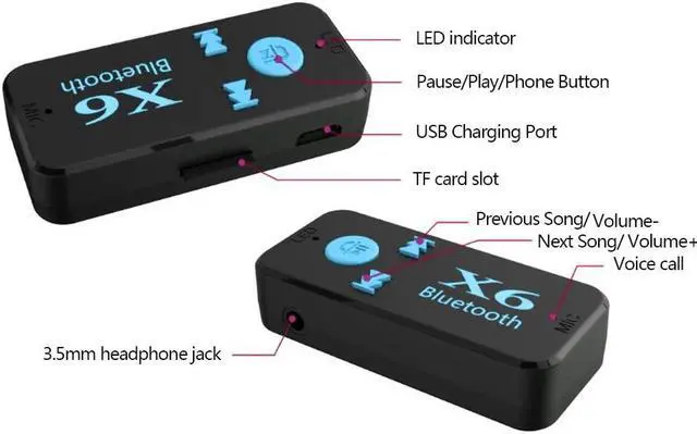 X6 Car Bluetooth Music Receiver (Hands-) is a high-tech wireless product that can receive music on a mobile phone or TF card or a Bluetooth-enabled transmitter. This music receiver can be used for almost all audio receivers with input plugs, including automotive devices. You can receive music from your Smartphone and MP3 at the home's speakers or the car's sound system. Enjoy the supreme car music, call solutions, use smart phones through the car audio call and listen to music. Gently press to call, enjoy the music stored in the phone or even play Internet radio. The product with an embedded echo cancellation microphone, only a button can be easily in the music and telephone switch between.