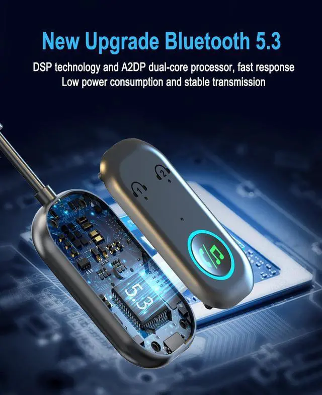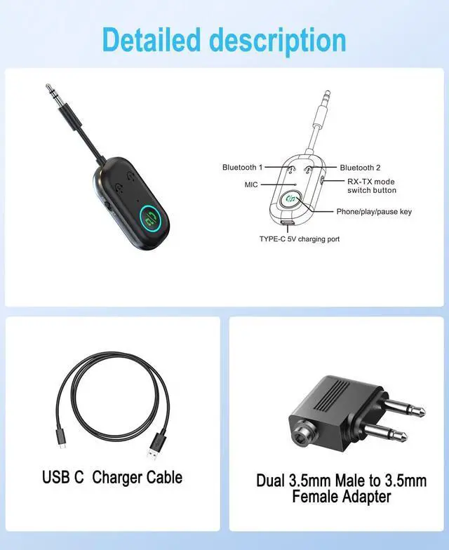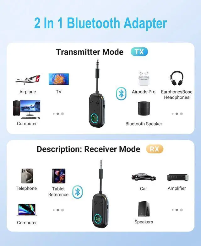 Multifunctional Bluetooth transmitterr: The 2-in-1 Bluetooth adapter uses the latest Bluetooth 5.3 technology, providing faster transmission speeds, more stable connections, and lower latency. Supporting transmit (TX) and receive (RX) modes, it can easily transmit audio from TV, airplane, computers and other devices to headphones or speakers wirelessly, completely saying goodbye to the constraints of audio cables.
