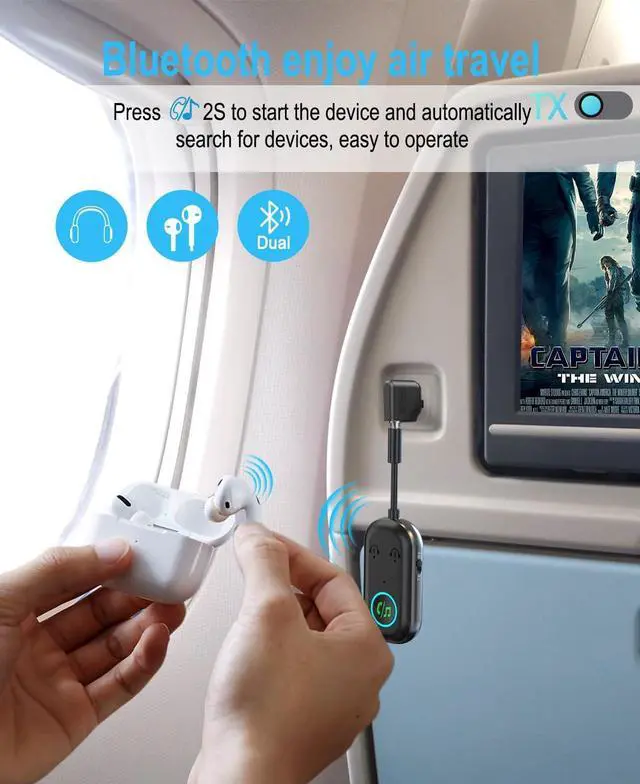 enjoy sharing: Airplane bluetooth adapter support connecting two Bluetooth devices at the same time, easily switch audio sources or share music and videos with friends. Suitable for multi-person scene needs, enhance the fun of use.