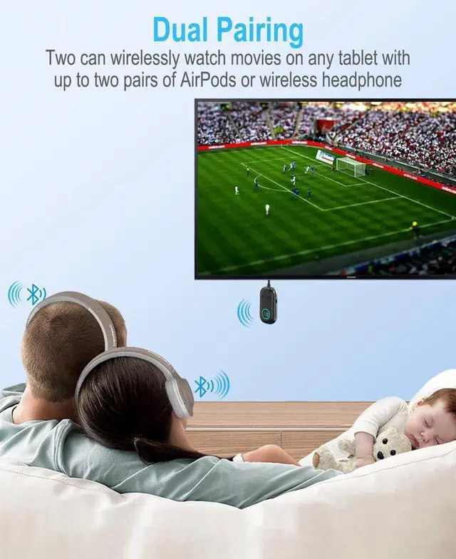multi-device support: dual bluetooth transmitter compatible with a variety of devices, suitable for Air Pods, headphones, speakers, fitness equipment smartphones, game devices (PSP, Nintendo Switch), cars, audio, etc., so that every device can enjoy the efficient connection and audio transmission.