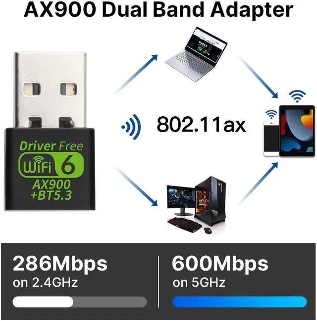 Dual-Band 2.4G /5GHz Wireless Connectivity: Coupled with Up to 900Mbps Data Transfer Rate ( 2.4G ax: up to 286Mbps; 5G ax: up to 600Mbps). This combination delivers the ultimate selling point of dual-band 900Mbps capability, ensuring faster and more stable connections even in congested wireless network environments.