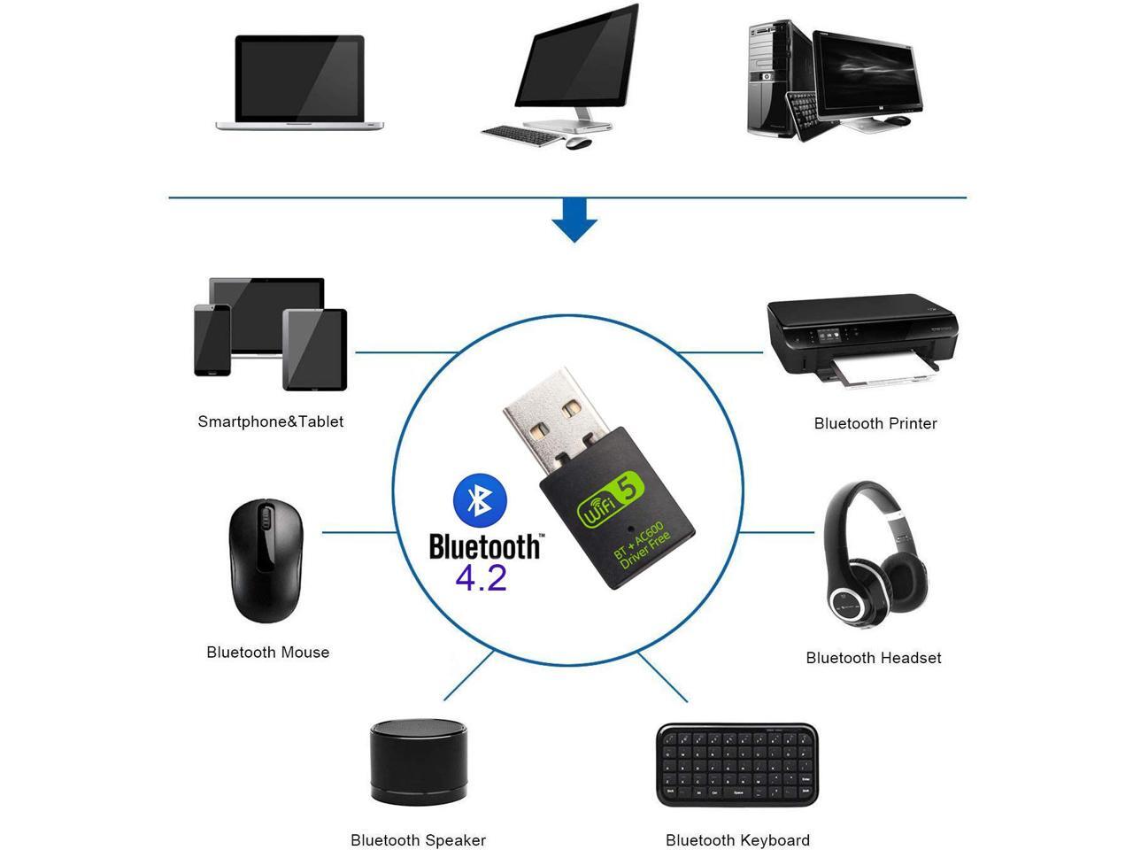 - [BLUETOOTH TRANSMITTER]:Bluetooth 4.2 enables your non-bluetooth PC to wirelessly connect with Bluetooth devices(such as smart phone, ipad, tablet, speaker, headset, keyboard, mouse, printer, projector,etc.) for data transfer,edit or print, up to 33ft connection distance(ONLY COMPATIBLE WITH WINDOWS 7/8/8.1/10)