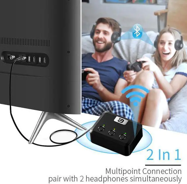 1. Dual Link Transmitter: One portable adapter to use as Dual Transmitter,pair to 2 bluetooth headphones or speakers at once.Dual connection is supported.