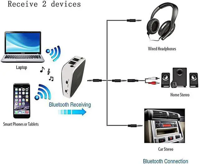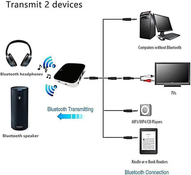 Under TX mode, two Bluetooth headphones can be paired at once so parents can watch in silence and give children a needed break; Under RX mode, two smart devices can be paired for playing different songs. Record 8 devices and automatically re-pairing with existing paired devices.