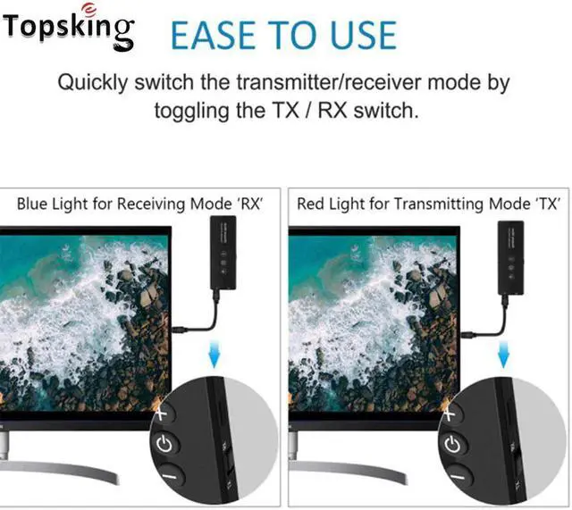 b) Turn the toggle switch to the 'RX' side, long press the 'Power' button 2 seconds to start up, and you will hear the prompt 'Bluetooth receiver mode', and the blue indicator light will flashes slowly.