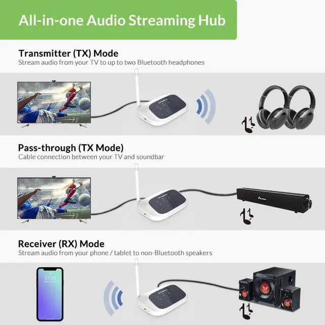 VERSATILE BLUETOOTH TRANSMITTER / RECEIVER] Bluetooth-enable virtually any of your audio devices at home. Use the TC500 as a transmitter to stream audio from your TV, or computer to a set of Bluetooth headphones. Or use the TC500 as a receiver and allow your home stereo or speakers to play streaming music from your cellphone or laptop.