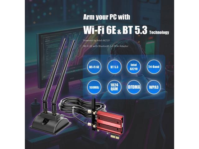 - Powered by Intel AX210 Controller, features Wi-Fi 6E (IEEE 802.11ax) and Bluetooth 5.3, backward-compatible with Wi-Fi 6/5/4. Comes with regular and low-profile brackets for ATX and slim PC cases.