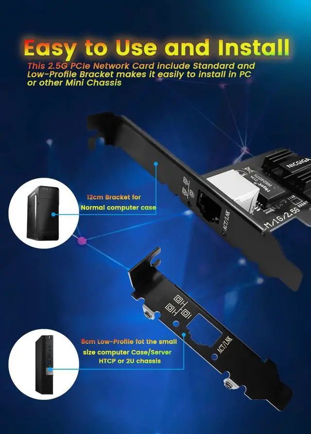 Note: Only work with PCIe slot not for PCI slot. [Widely Use with Heat Sink]Comes with standard bracket and low-profile-bracket to meet the needs of different cases such as desktop workstation server mini tower computer and so on. Excellent heat dissipation can reduce the temperature quickly and maintain the stability of network transmission. [Customer Service]Friendly service for lifetime technical support and 1 year warranty free exchange. If you encounter any problems please contact us our customer team will slove the problem for you within 24 hours.