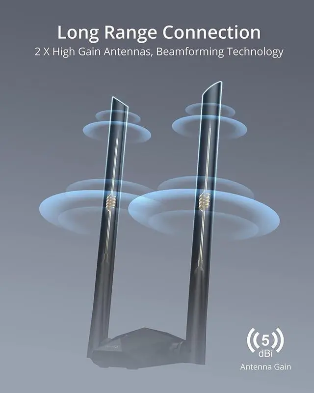 Broader Range: 2 pieces of 5dBi high gain antennas ensure stronger signal reception through multiple walls and floors. Beamforming technology delivers targeted signals and reliable connections no matter where your PC is located
