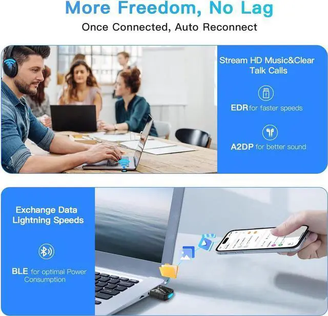 [Bluetooth 5.4 Adapter] Bluetooth dongle can allow your Non-Bluetooth PC Laptop to feature latest Bluetooth 5.4 function at once. Then you can enable your PC to pair & connect with Bluetooth headphones/headset/mouse/keyboard/printer to enjoy stereo, clear calling, wireless operation or files transfer freely.