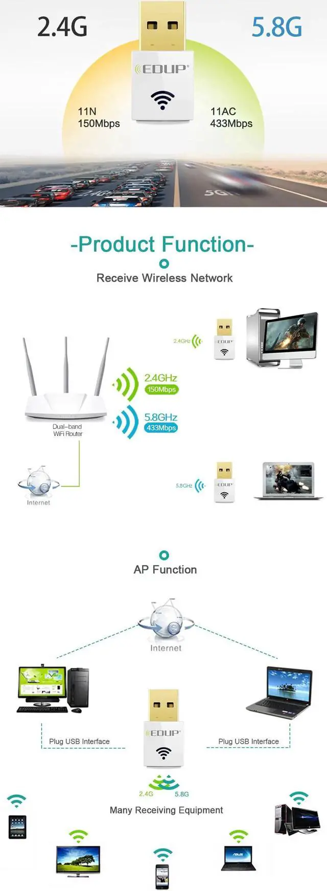 Transmission speed 2.4GHz up to 150Mbps and 5GHz up to 433Mbps