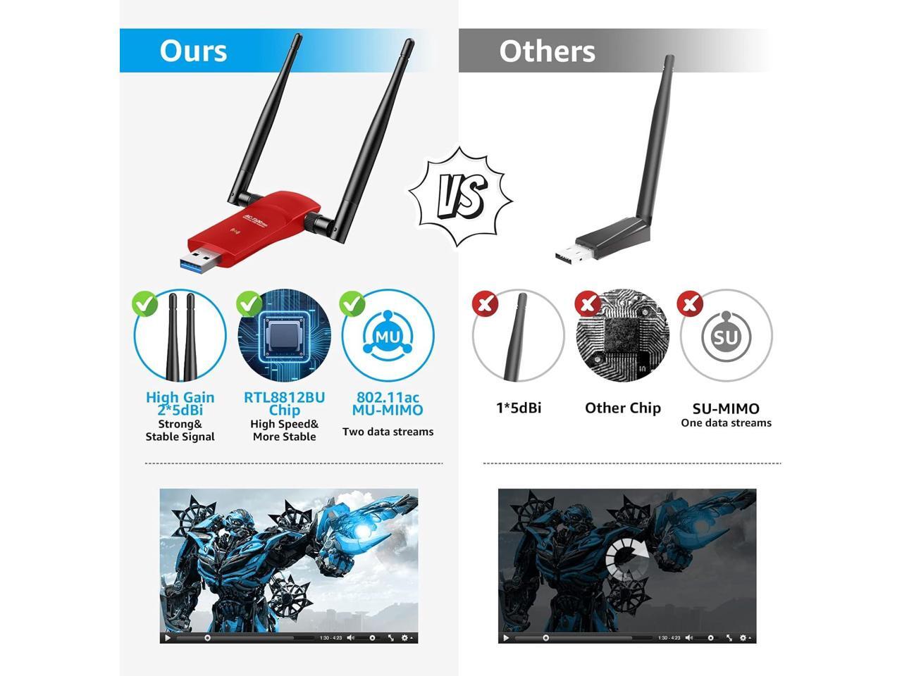 - High Gain Dual-band Antenna: USB wifi antennas adopted dual band 5G/2.4G 5dBi antenna, 5Ghz wifi speed up to 867Mbps,2.4GHz 400Mbps. Advance WiFi chip 8812BU bring faster speed and more stable signal for gaming, and streaming online is much more enjoyable without buffering or interruptions.