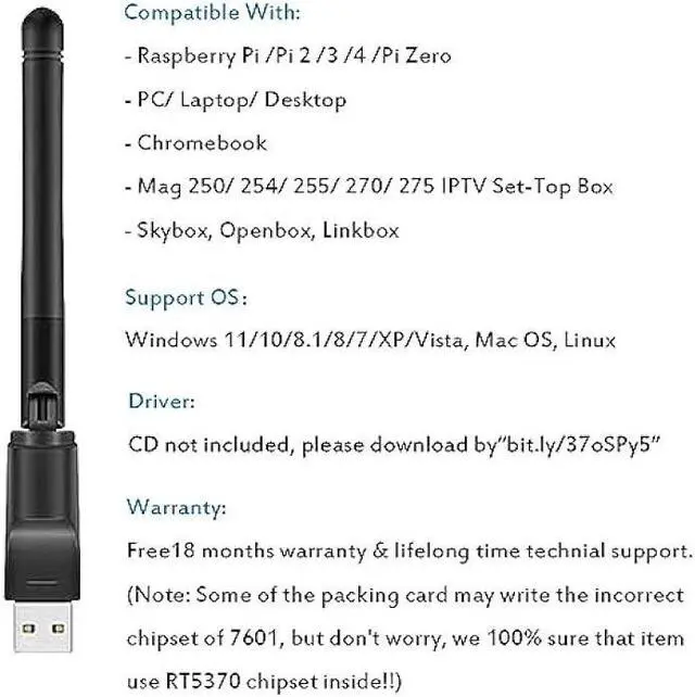 Driver CD NOT included, you can see the driver download link from product images. Besides, item come with Free 18 months warranty and lifelong time technial support. (Note: Some of the packing card may write the incorrect chipset of 7601, but please don't worry, we are sure that item use RT5370 chipset inside!! )