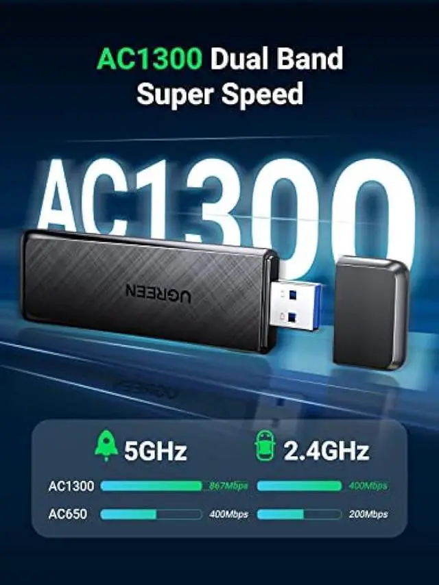 High Speed: UGREEN AC1300 USB 3.0 wifi adapter can up to 867Mbps in 5.0GH z band, and up to 400Mbps in 2.4GH z band. Whether you are online gaming, surfing the Internet, online HD video streaming, upload, or download, it can perfectly meet your needs like a wired network.