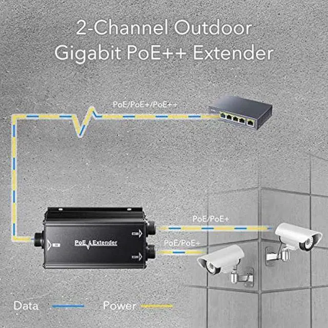 2 Channel gigabit outdoor PoE extender, easy to extend PoE Power to two PoE devices, such as Wireless APs, Base Stations, Network Cameras or other PoE devices through an exterior network data cable.
