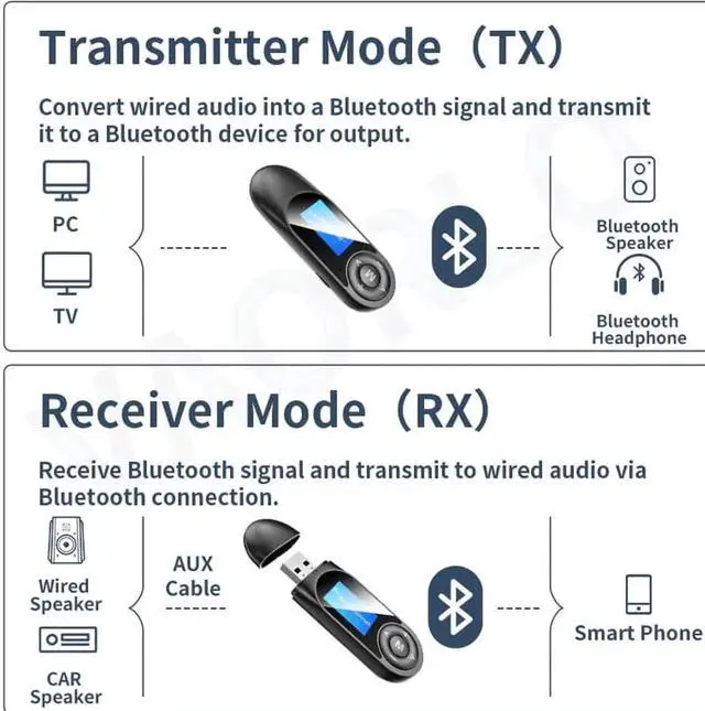 TRANSMITTER RECEIVER MODE: 2in1 design, by using this wireless adapter, you can send and receive all of the audio freely and easily. Transmitter enables your TV, AV Receiver, Radio and other home audio source devices to stream music to your Bluetooth headphones or speakers; Receiver lets non-Bluetooth devices like your home stereo or AV Receiver and wirelessly stream music from your cellphone/PC.