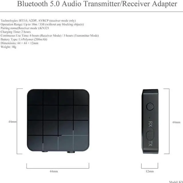 The KN321 is just 44mm ( 1.73 ) across and weighs only 18g ( 0.63 oz), but has got powerful wireless audio streaming capabilities. Slip this transmitter & receiver into your backpack or laptop bag and take it on-the-go without the slightest effort.