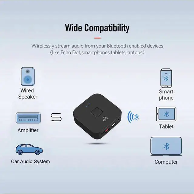 This 5.0 Receiver can be connected to any A/V receivers and any powered speakers with standard 3.5 mm jack or 2RCA ports, ideal compatible for home theaters, stereo systems, and car stereos, also suitable for iPhone, iPad, iPod Touch, Smart Phones, and Android devices.