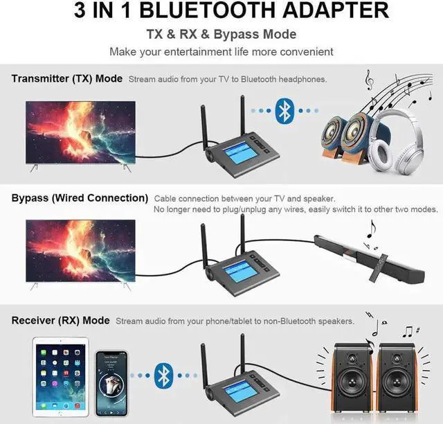 Choose Aptx HD or Aptx Low Latency before you power on this device, then you could enjoy video or TV show without lip-sync issues via Choosing Aptx Low Latency, and you could enjoy Hi-Fi level music via choosing Aptx HD.