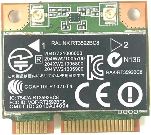 PCI Express SPS: 630813-001 Used (Tested well, like new) Ralink Mini PCIe Wireless Lan Card RT3592 Features: The RT3592 single chip is a highly integrated MAC/BBP and 2.4 /5GHz RF single chip with support for 300 Mbps PHY rate. It fully complies with IEEE 802.11 n draft 4.0 and IEEE 802.11 a/b/g, features rich wireless connectivity at high standards, and delivers reliable, cost-e ective throughput from an extended distance.
