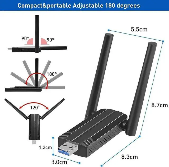 DUAL 5DBI HIGH GAIN ANTENNA - USB wireless adapter equipped with 5dBi dual antennas, 180°/90° angle adjustable, achieve stronger network speed, wider network coverage, more stable connection, stronger penetration and adapt to more environments.