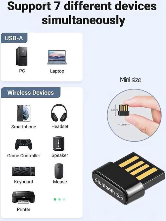 [Multiple connections] Bluetooth 5.3 adapter can connect 7 devices at the same time. Supports various protocols such as GAP, A2DP, HID OVER GATT, HSP, AVC, HFP, FTP