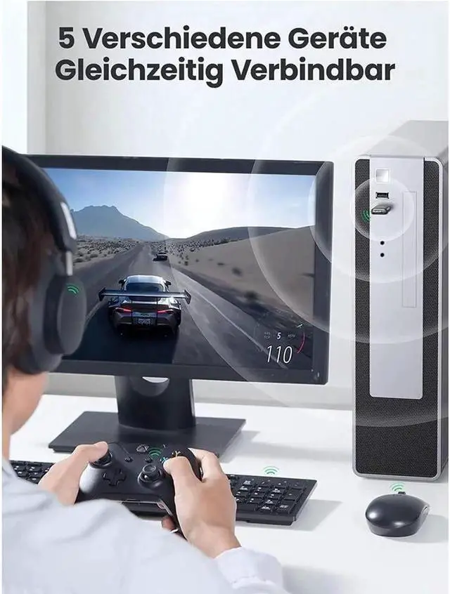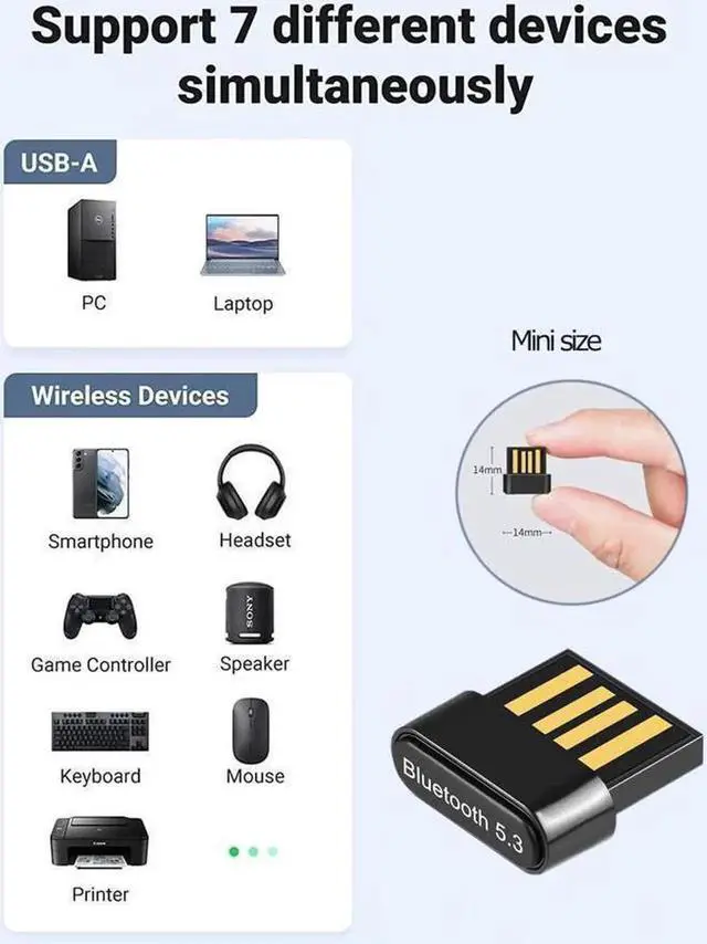 • [Multiple connections] Bluetooth 5.3 adapter can connect 7 devices at the same time. Supports various protocols such as GAP, A2DP, HID OVER GATT, HSP, AVC, HFP, FTP. (Note: multiple audio devices cannot be used simul