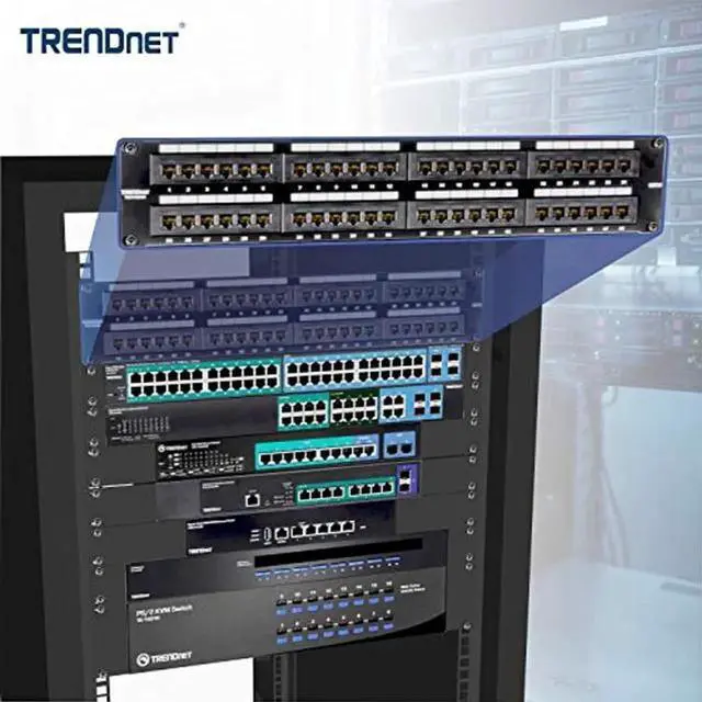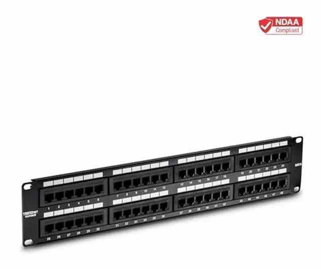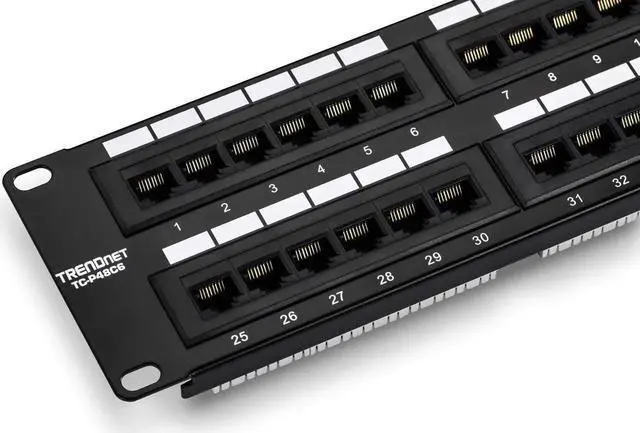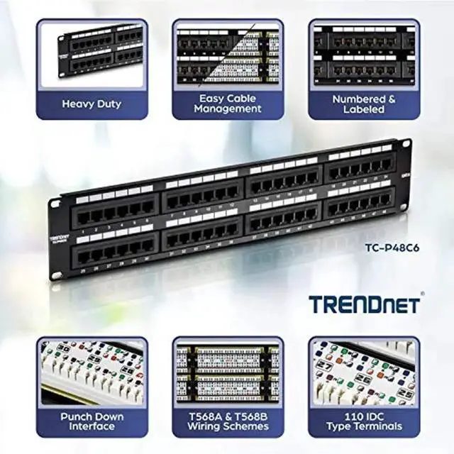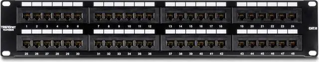 Prepare yourself for Copper Gigabit Ethernet with TREND net's Cat. 6 RJ-45 UTP Patch Panels. These patch panels are certified for 250Mhz Category 6, which are perfect for Copper Gigabit Ethernet connections. TREND net's 48-port Cat. 6 Patch Panels are ideal for Ethernet, Fast Ethernet and Copper Gigabit Ethernet (1000Base-T) network applications. Using TREND net's Cat. 6 products now, will prepare you for the high bandwidth network in the future without re-cabling your network. Meets ANSI/EIA/TIA 568-B. 2-1 and ISO/IEC 11801 Standards New version 110D IDC type terminal blocks (use 110 or Krone type tool) Color-coded labeling for T568A and T568B wiring schemes 180° angle type (horizontal) 1000Base-T Copper Gigabit Ethernet ready Compatible with Cat.